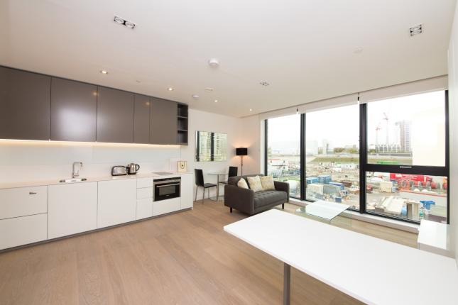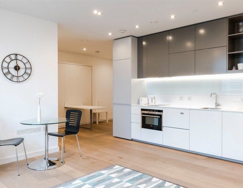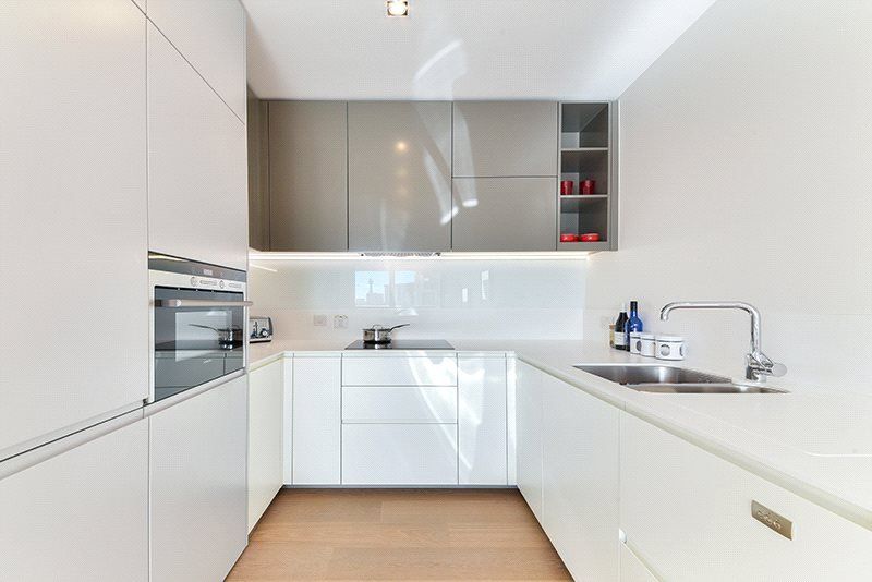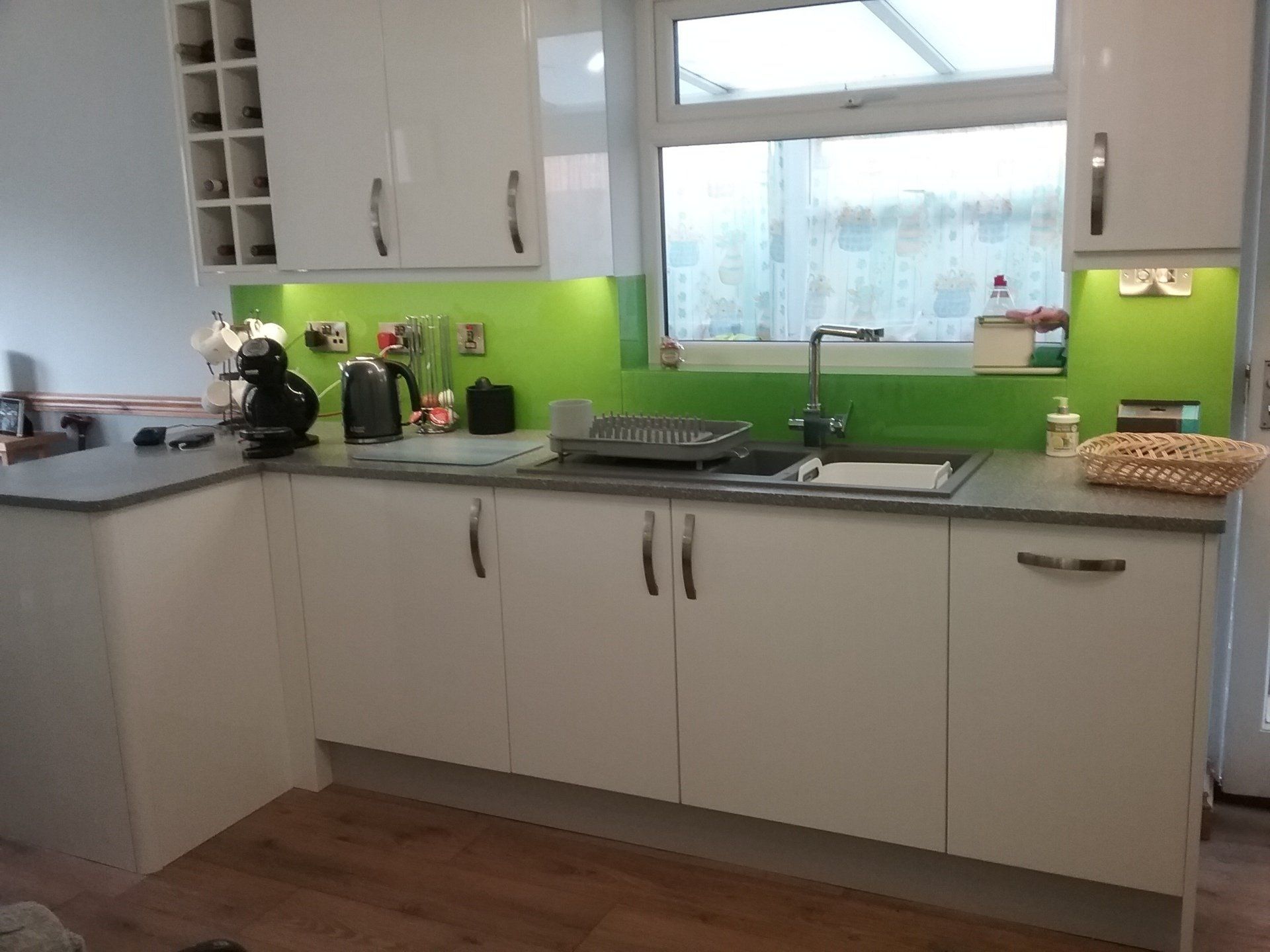 This gloss white slab door really keeps a minimilistic feel to the kitchen, with the addition of a green splashback and bow handles.
