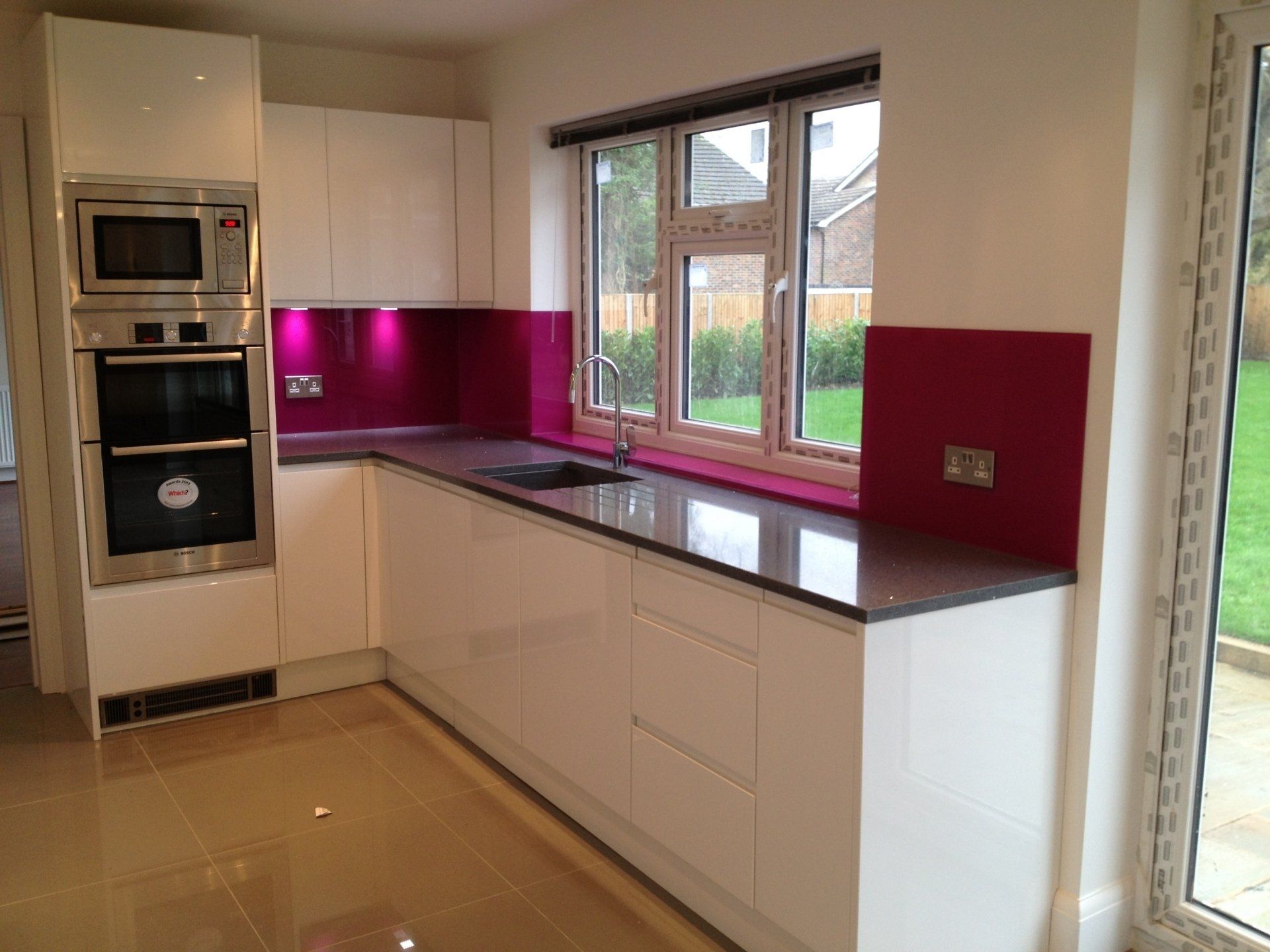 The modern handleless door offers both a sleek and stylish feel. Mixing the white gloss with a purple splash back really adds a bit of flavour to the kitchen.